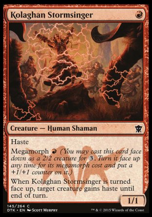 Haste (This creature can attack, and as soon as it comes under your control.)Megamorph (You may cast this card face down as a 2/2 creature for . Turn it face up any time for its megamorph cost and put a +1/+1 counter on it.)