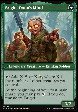 Whenever this creature enters or transforms into Brigid, Clachan's Heart, create a 1/1 green and white Kithkin creature token.