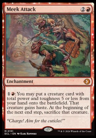 : You may put a creature card with total power and toughness 5 or less from your hand onto the battlefield. That creature gains haste (This creature can attack, and as soon as it comes under your control.). At the beginning of the next end step, sacrifice that creature.