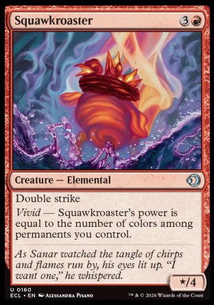 Double strike (This creature deals both first-strike and regular combat damage.)Vivid — Squawkroaster's power is equal to the number of colors among permanents you control.