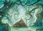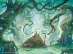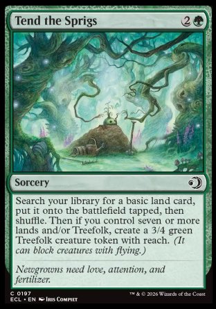 Search your library for a basic land card, put it onto the battlefield tapped, then shuffle. Then if you control seven or more lands and/or Treefolk, create a 3/4 green Treefolk creature token with reach (This creature can block creatures with flying.).