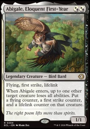 When Abigale enters, up to one other target creature loses all abilities. Put a flying (This creature can't be blocked except by creatures with flying or reach.) counter, a first strike (This creature deals combat damage before creatures without first strike.) counter, and a lifelink (Damage dealt by the creature also causes its controller to gain that much life.) counter on that creature.