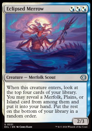 When this creature enters, look at the top four cards of your library. You may reveal a Merfolk, Plains, or Island card from among them and put it into your hand. Put the rest on the bottom of your library in a random order.