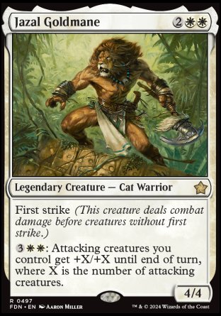 First strike (This creature deals combat damage before creatures without first strike.): Attacking creatures you control get +X/+X until end of turn, where X is the number of attacking creatures.
