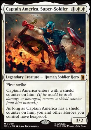 Captain America enters with a shield counter (If the creature would be dealt damage or destroyed, remove a shield counter from it instead.) on him.