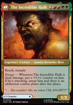 Enrage — Whenever The Incredible Hulk is dealt damage, put a +1/+1 counter on him. If he's attacking, untap him and there is an additional combat phase after this phase.
