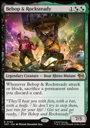 Whenever Bebop & Rocksteady attack or block, sacrifice a permanent unless you discard a card.