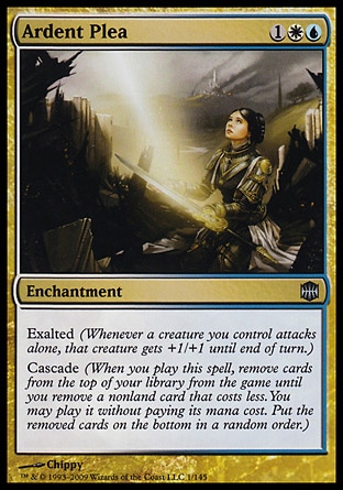 Exalted (Whenever a creature attacks alone, that creature gets +1/+1 until end of turn for each instance of exalted among permanents its controller controls.)Cascade (When you cast this spell, exile cards from the top of your library until you exile a nonland card that costs less. You may cast it without paying its mana cost. Put the exiled cards on the bottom in a random order.)