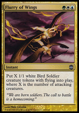 Create X 1/1 white Bird Soldier creature tokens with flying (This creature can't be blocked except by creatures with flying or reach.), where X is the number of attacking creatures.