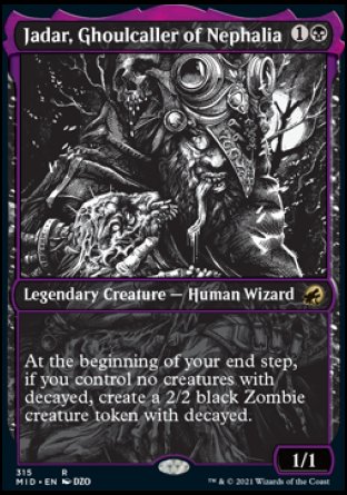 At the beginning of your end step, if you control no creatures with decayed (It can't block. When it attacks, sacrifice it at end of combat.), create a 2/2 black Zombie creature token with decayed (It can't block. When it attacks, sacrifice it at end of combat.).