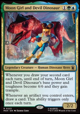 Whenever you draw your second card each turn, until end of turn, Moon Girl and Devil Dinosaur's base power and toughness become 6/6 and they gain