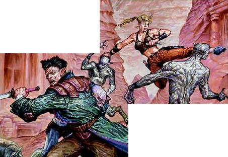 Repentant Vampire and Gallantry (Odyssey), illustrated by Mark Tedin, line up to form one scene. The characters fighting are references to Buffy and Angel from the Buffy Vampire Slayer Saga. Source